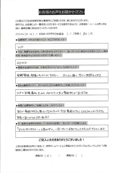 アンケートにお答えいただいたように、N・H様も、まさに今このページをご覧の皆様と同じように、この「お客様の声」にてADHDの方の受給事例をご覧になり、お問合せいただいたとのことです。