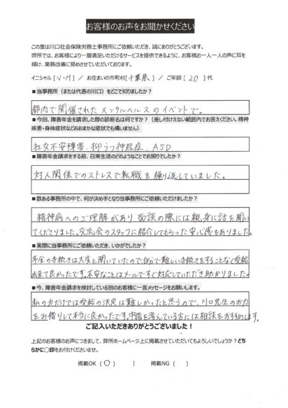 私の力だけでは受給の決定は難しかったと思うので、川口先生のお力をお借りして本当に良かったです。申請を考えている方には相談をおすすめします。