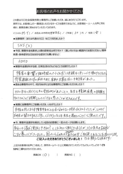 M・T様の場合、上京したばかりで、就労も安定せず、何の福祉サービスにもつながっていない状況でした。当事務所にお問合せいただいたことをきっかけに障害年金だけでなく、精神保健福祉手帳の取得に繋がり、就労移行支援事業所の見学にも行かれました。